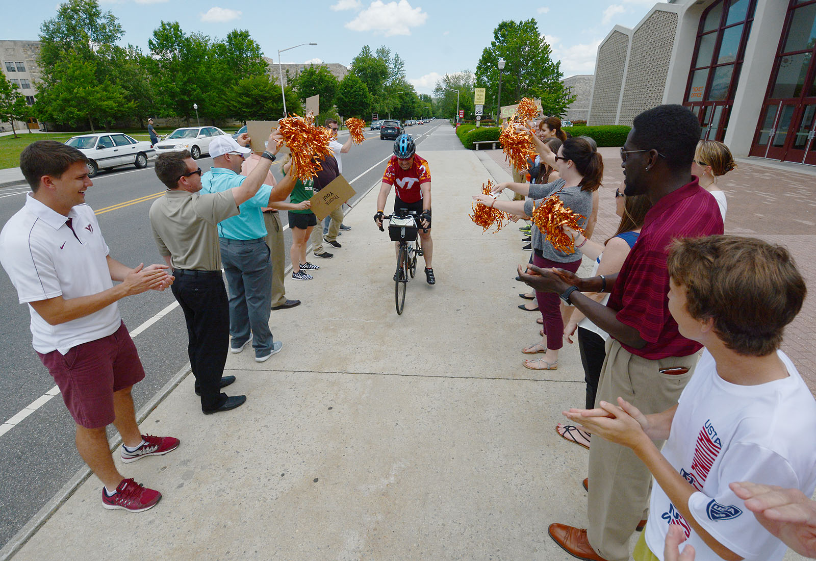 I made it to Hokie House and met up with some of the faster riders. It was getting close to the senior staff meeting starting time so at the urging of one of my co-workers I made the ride up to the office. As I come up over the hill on Washington Street to Cassell Coliseum I could see a large group of people outside. They had signs and pom-poms and it just took me by surprise. I rode up to them and just became overwhelmed by all the support they have given me.
